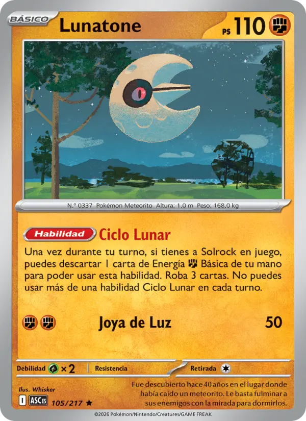 Una vez durante tu turno, si tienes a Solrock en juego, puedes descartar 1 carta de Energía {F} Básica de tu mano para poder usar esta habilidad. Roba 3 cartas. No puedes usar más de una habilidad Ciclo Lunar en cada turno.