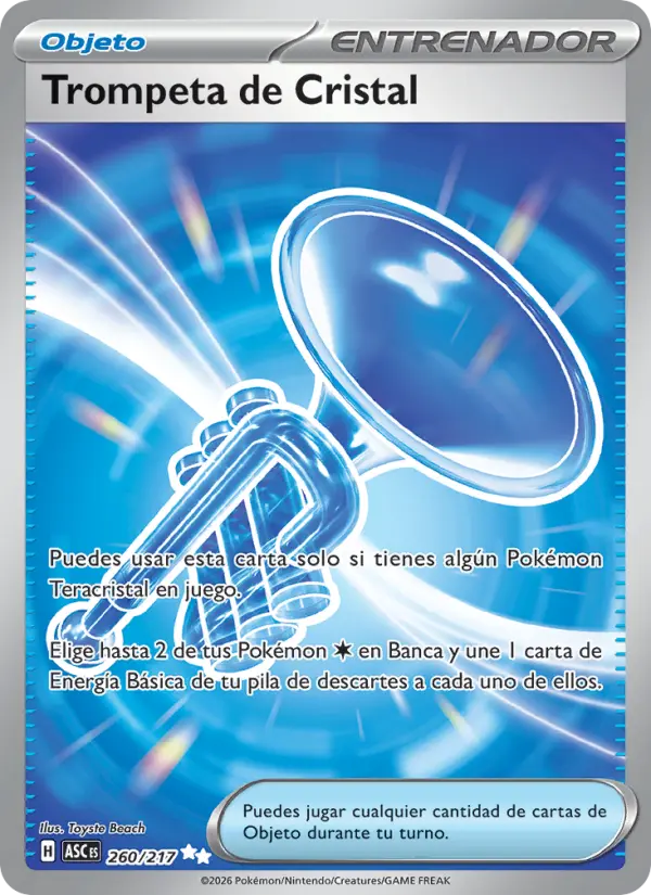 Puedes usar esta carta solo si tienes algún Pokémon Teracristal en juego. Elige hasta 2 de tus Pokémon {C} en Banca y une 1 carta de Energía Básica de tu pila de descartes a cada uno de ellos.